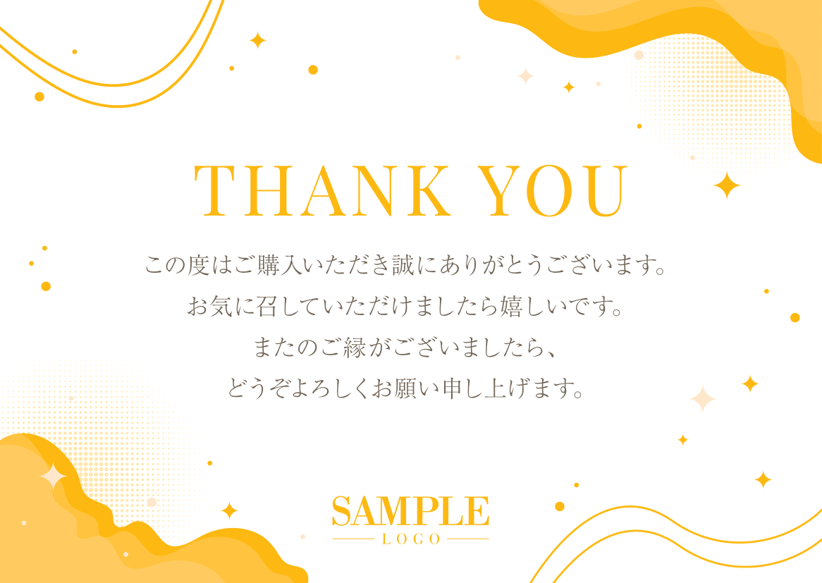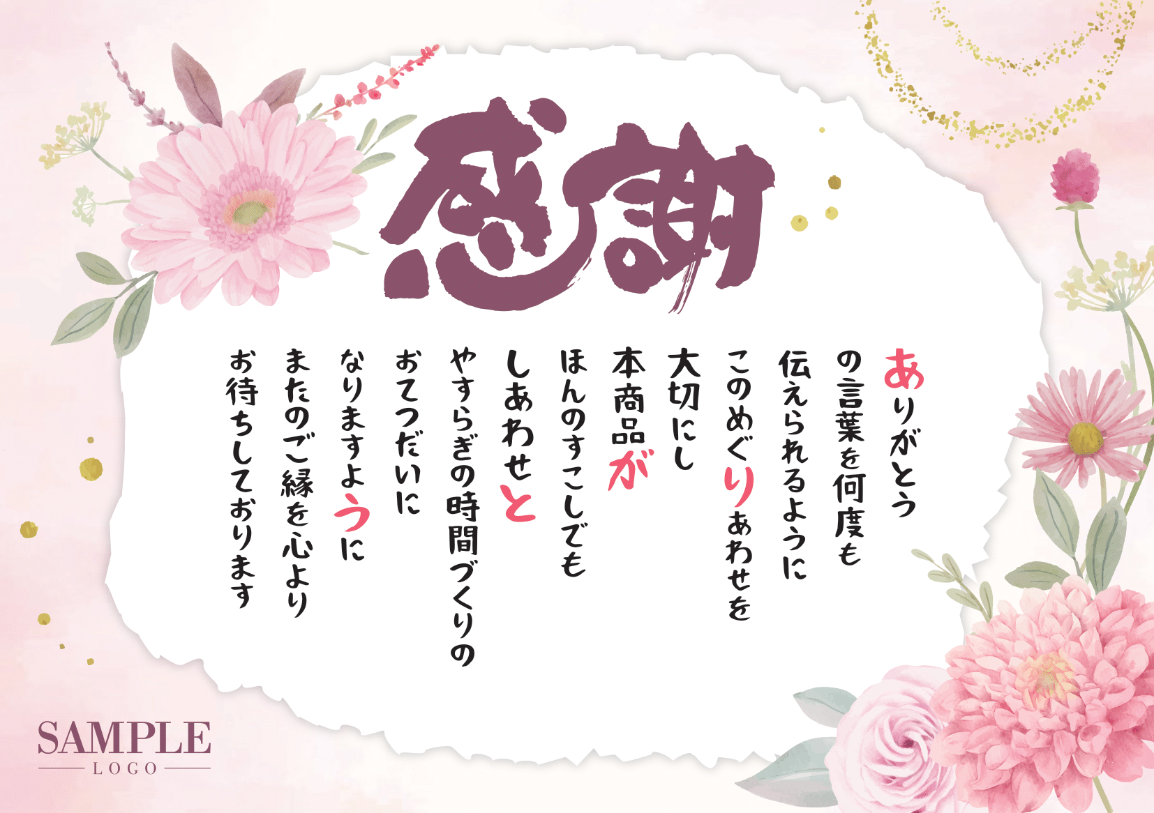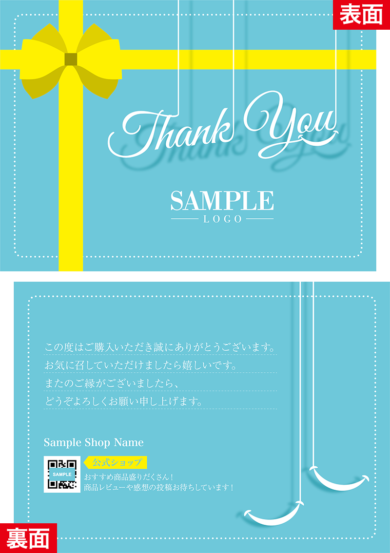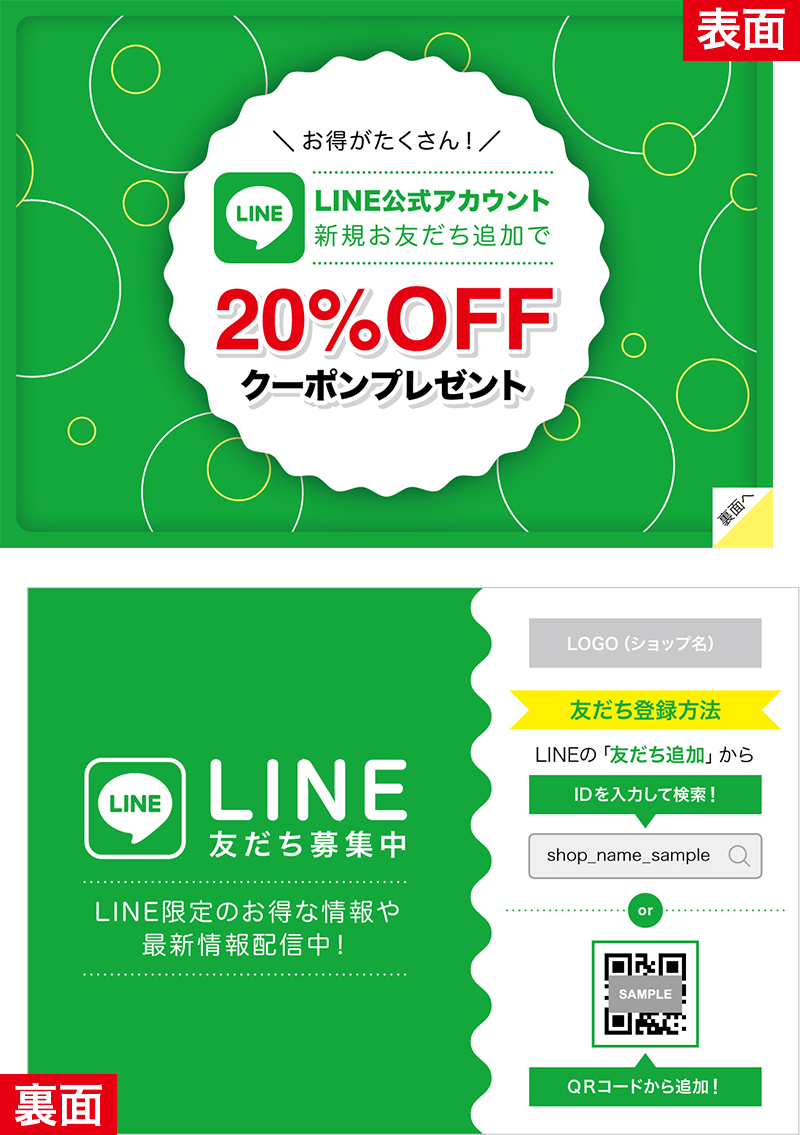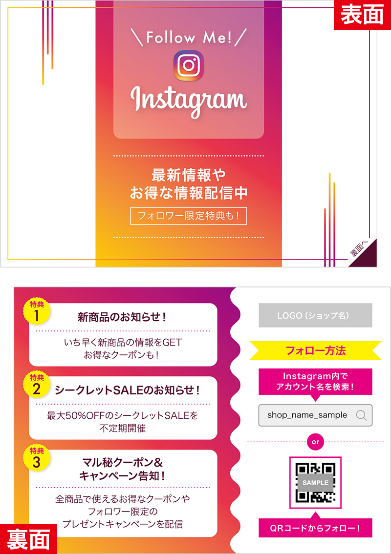 ④お礼状-D ポップなお礼状。A6サイズ両面カラー ※公式サイトやInstagramなど、QRコードでリンクさせたいURLがあればお知らせください。 ⑤SNS募集(LINE) LINEの友達追加促進チラシ。A6サイズ両面カラー ※新規友だち登録の際の特典か、表面でアピールしたい内容をお知らせください。 ⑥SNS募集(Instagram) Instagramフォロー促進チラシ。A6サイズ両面カラー ※フォローしていただくための、特典内容を1~3つ考案いただき、お知らせください。