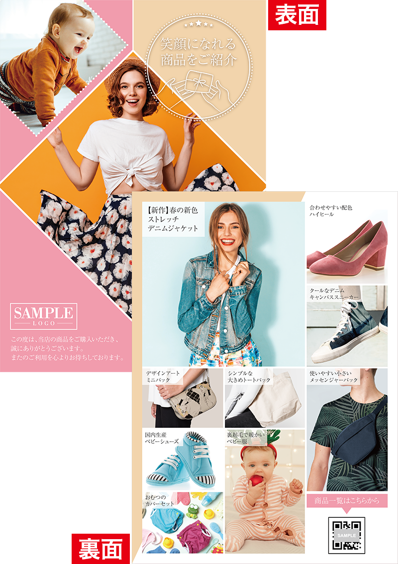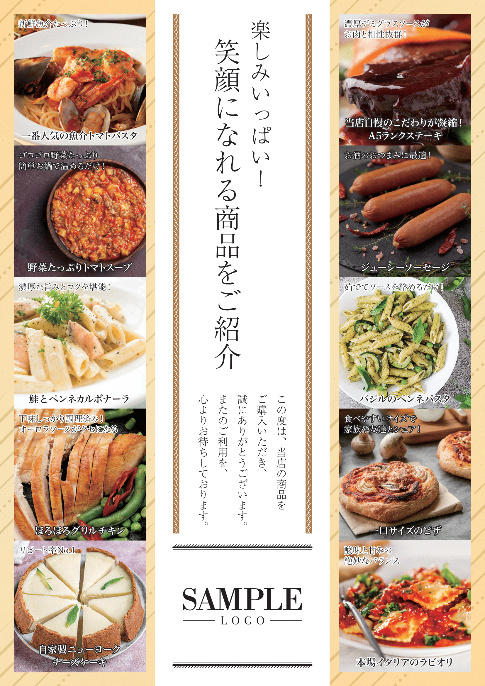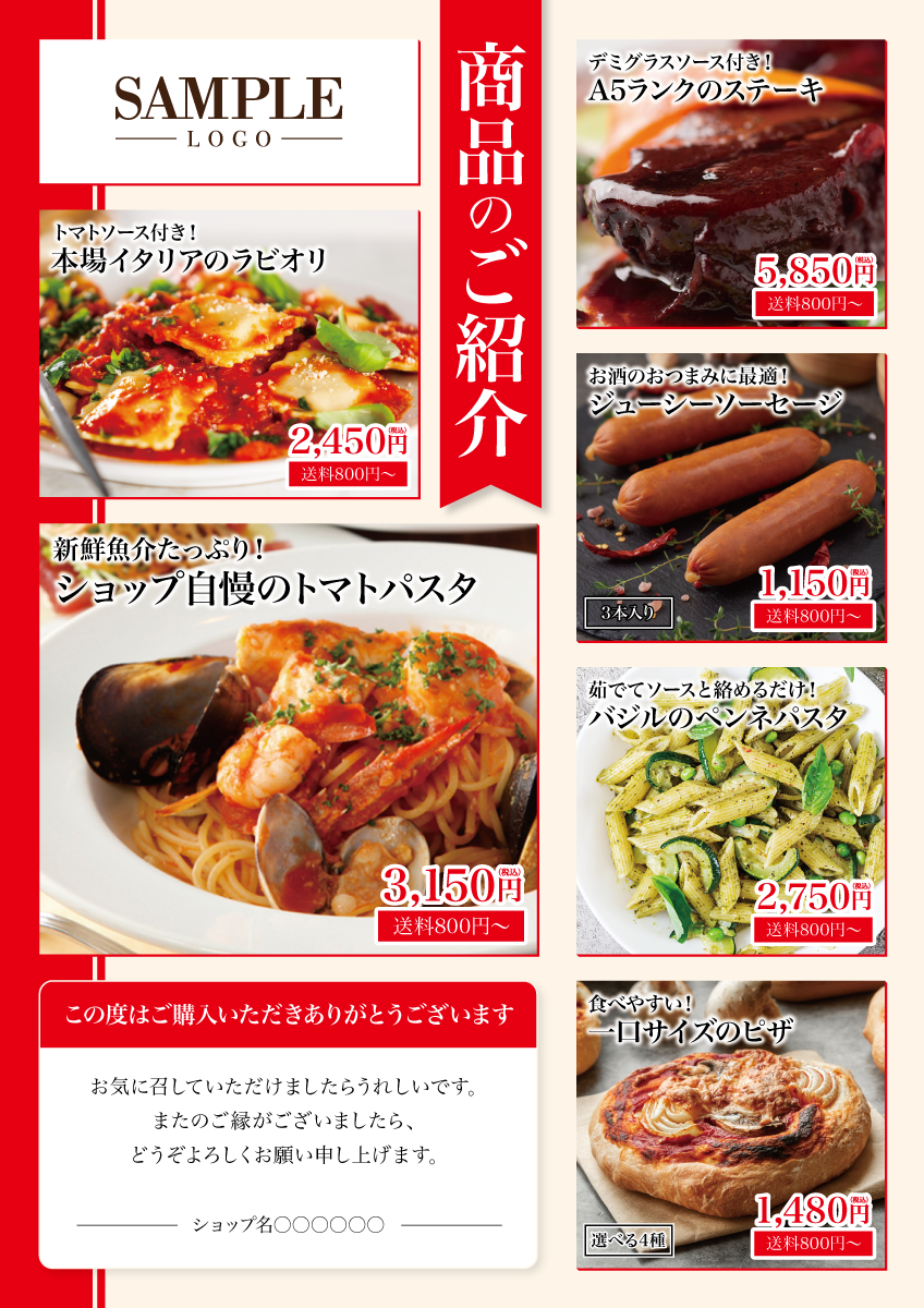 ⑦商品紹介-A 商品紹介が可能なチラシ。A5サイズ両面カラー ※チラシに掲載希望の商品を7~12点お知らせください ⑧商品紹介-B 商品紹介が可能なチラシ。A5サイズ片面カラー ※チラシに掲載希望の商品を6点お知らせください ※フリーテキスト箇所に記載したい文言があればお知らせください ⑨商品紹介-C 商品紹介が可能なチラシ。A5サイズ片面カラー ※チラシに掲載希望の商品を10点お知らせください ※フリーテキスト箇所に記載したい文言があればお知らせください