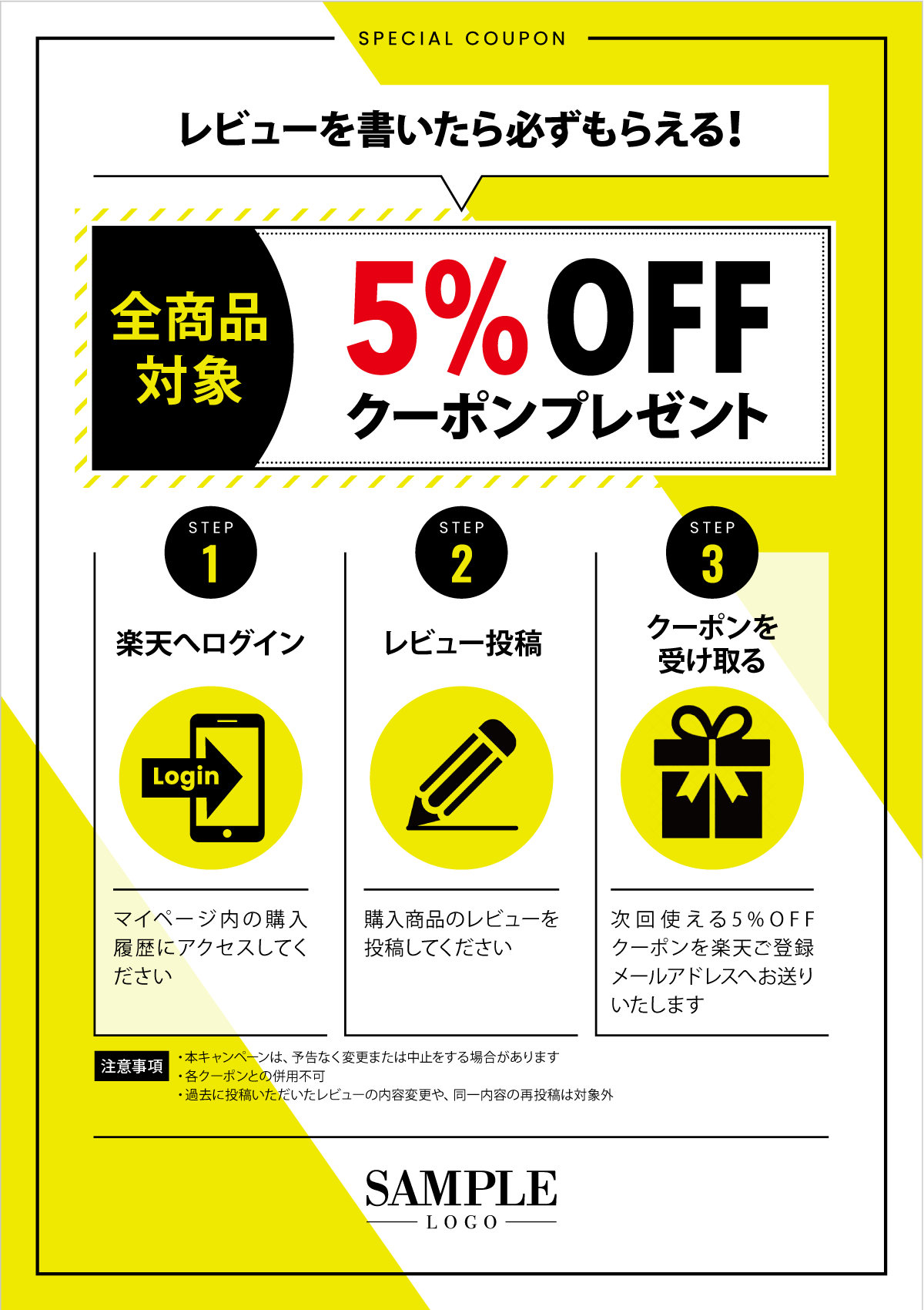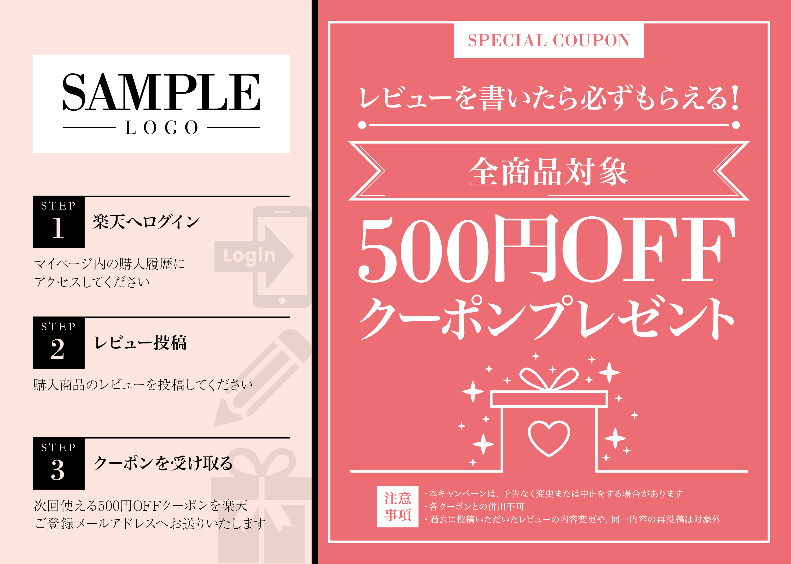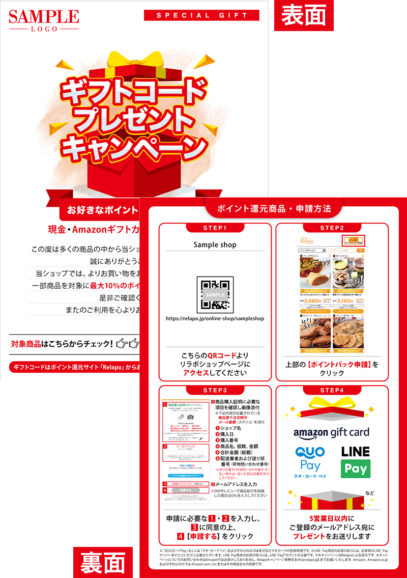 ⑩レビュー促進チラシ-A レビューを掲載してくれた方にクーポンを配布する旨の案内チラシ。A5サイズ横・片面カラー ※ご希望のクーポン内容(300円OFFや10%OFFなど)や、注意事項の追加ご希望ございましたらお知らせください ⑪レビュー促進チラシ-B レビューを掲載してくれた方にクーポンを配布する旨の案内チラシ。A5サイズ縦・片面カラー ※ご希望のクーポン内容(300円OFFや10%OFFなど)や、注意事項の追加ご希望ございましたらお知らせください ⑫ギフトコードプレゼント 『Relapoに申請するとポイント還元』という、消費者の購買意欲促進を狙ったチラシ。A5サイズ両面カラー